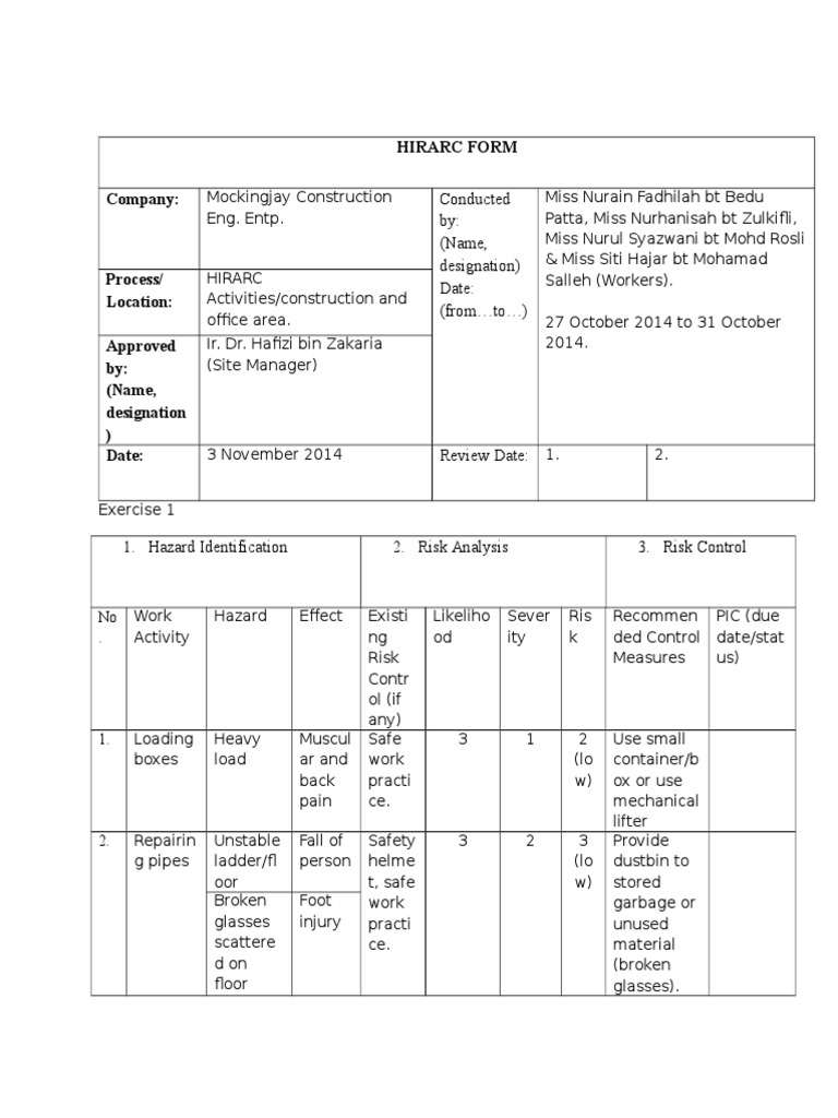 Likelihood of occurrence and. HIRARC is an integration tool to identify assessmeasure and to control hazard and risk of any workplace and its activities. Borang Hirarc 2020 UTMOSHE-P0612-HIR Agensi Nuklear Malaysia.